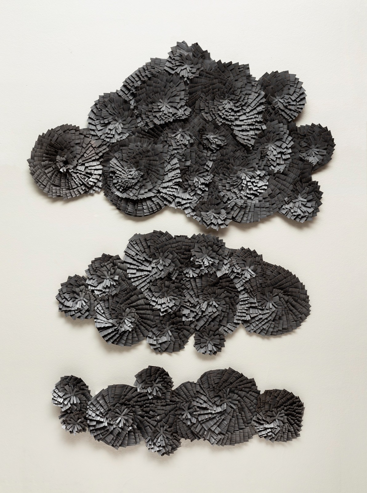 “La decisión de mi trabajo nace desde lo micro, sospechando que en ese mínimo fragmento se esconde un mundo macro —explica la artista—. Pequeños trozos de papel que al plegarse y distribuirse sugieren que lo material involucra movimientos donde convergen tiempos, espacios y formas. Energías que muestran luces y sombras, vacíos y plenitudes”.
