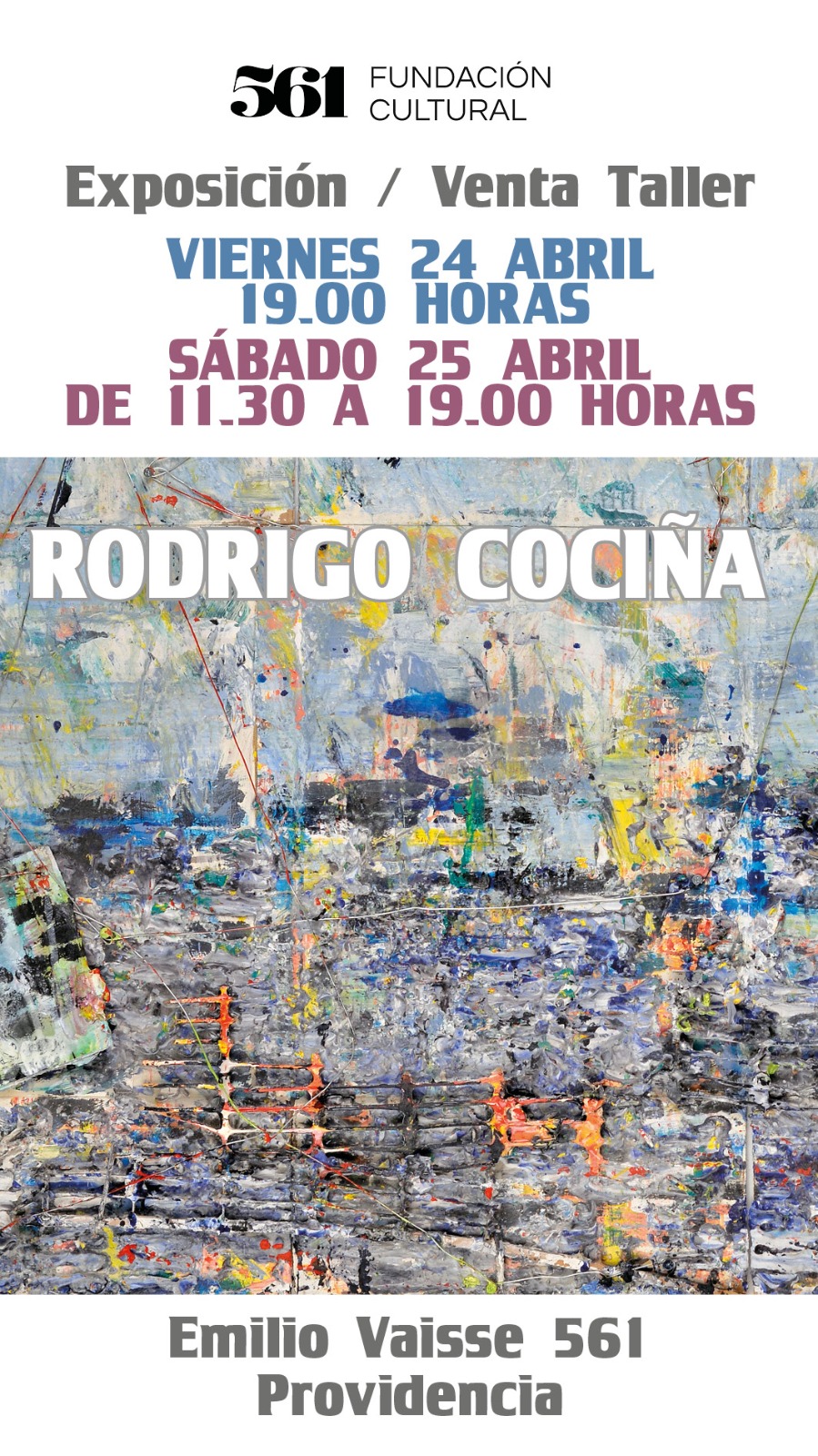 La Fundación Cultural 561 realizará los días 24 y 25 de abril una venta exclusiva de pinturas y esculturas del artista chileno Rodrigo Cociña, en una instancia abierta al público que busca acercar el arte contemporáneo a nuevos públicos y coleccionistas.
