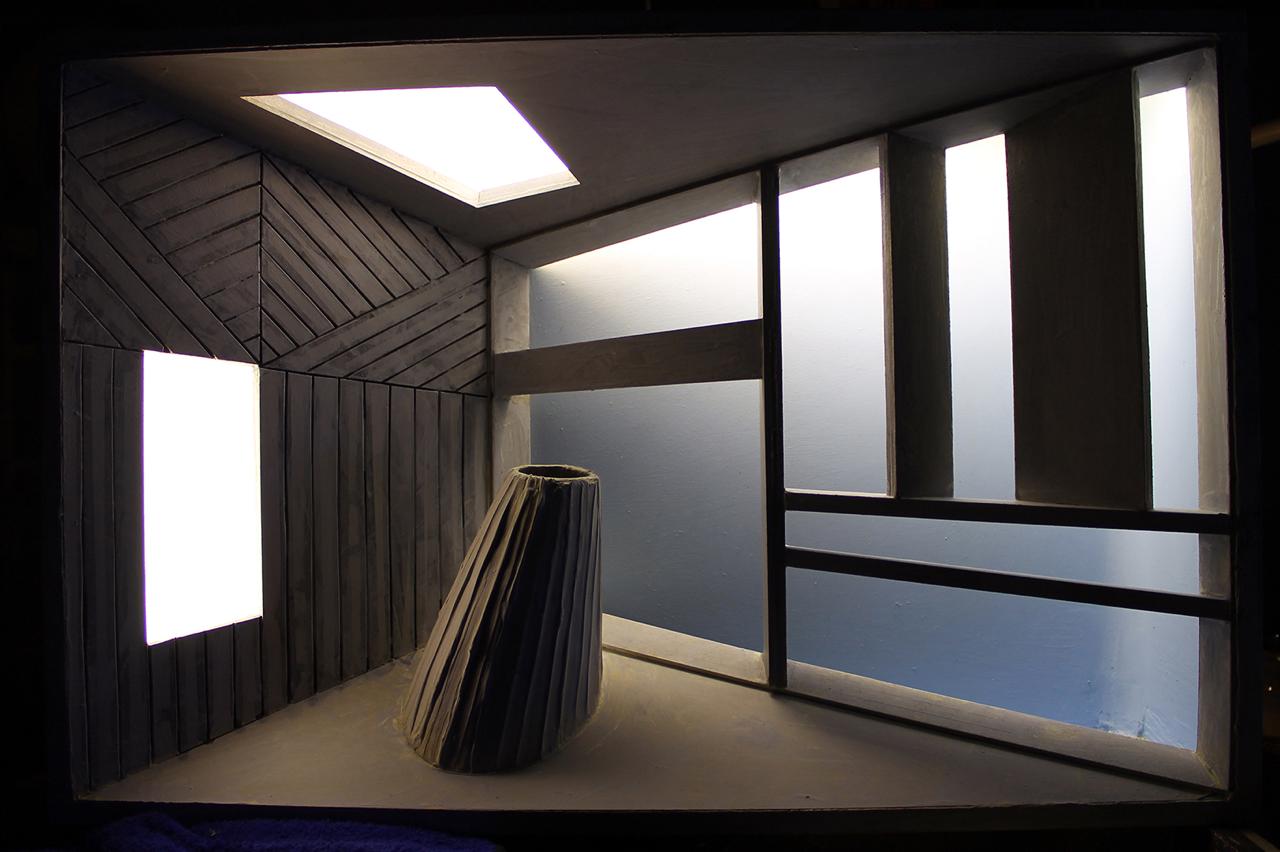 Generalmente la sombra en mis instalaciones es pensada tomando en cuenta la escala del lugar donde se exhibirá, igual esto tiene un carácter modular, puede cambiar dependiendo de cada lugar donde vuelva a exponerse la obra, se necesita un lugar cerrado con poca o nula entrada de luz natural. La sombra tiene una dualidad metafórica muy compleja, es a la vez romántica y también siniestra, se mezcla deseo, fascinación, melancolía, temor. Además, si la exposición se realiza en un lugar subterráneo como me ha tocado varias veces, la sensación aumenta. Es clave poder jugar con los vanos y llenos de una maqueta, como se proyectan los huecos de las ventanas y los muros, como si fuera una persiana, la sombra necesita de su propia ausencia o calado para configurarse. En el caso de Soplos de Luz sobre el Edificio Copelec de Chillán, lo clave fue la relación sensorial y cognitiva con el lugar. Este es uno de los edificios chilenos más célebres a escala mundial, fotografiado innumerables veces. Sin embargo, al recorrerlo en persona, hay dos fenómenos para mi radicales: el carácter íntimo de su espacialidad, bastante más acotado de lo que uno se imagina antes de visitarlo remitiéndose a aquellos registros fotográficos; como también cierto hálito o temperatura más baja que del exterior cuando lo recorrí por primera vez un caluroso verano de 2014, como de una pequeña capilla.